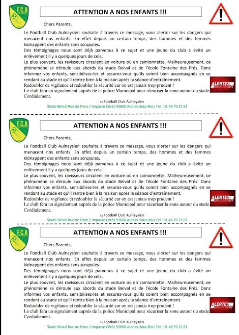 Le football club Aulnaysien, souhaite à travers ce message vous allerter sur les dangers qui menacent nos enfants. En effet depuis un certan temps, des hommes et des femmes kidnappent des enfants sans scrupules.